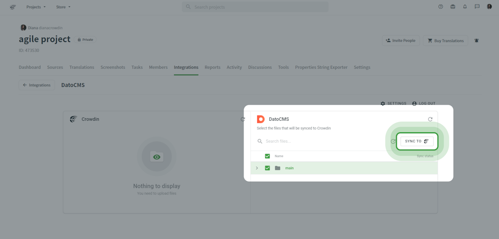 Click on the DatoCMS app to access the integration settings. Here, you can configure the integration to automatically sync your DatoCMS content with your Crowdin project. Don’t forget add language codes for the target languages DatoCMS Crowdin app settings.