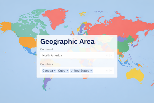 This DatoCMS plugin includes 2 fields for selecting a continent and one or more countries of the selected continent.
