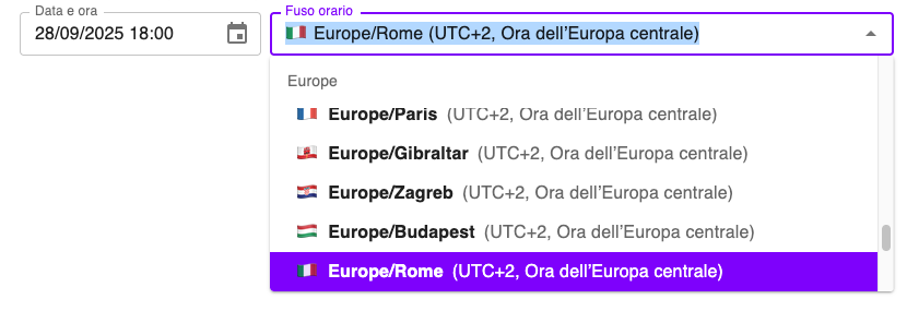 The plugin supports localized datetime entry and time zone names in the following languages (same as in DatoCMS itself):