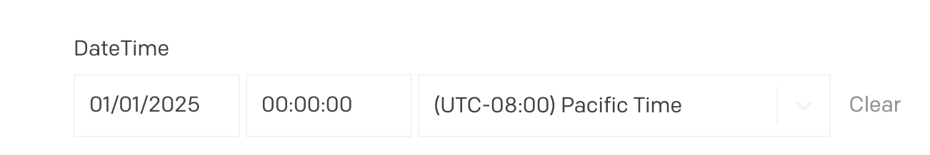 In the date picker field, you initially enter 2025-01-01T00:00:00-08:00 in US Pacific time and click save: