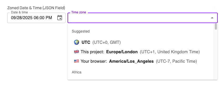 This is a DatoCMS field editor plugin for storing zoned datetime information in a JSON field. It provides a GUI for picking a date, time, and IANA timezone, then stores a JSON object that includes an ISO 8601 datetime string, a RFC 9557/IXDTF zoned datetime string, a UNIX timestamp, and other helpful fields.