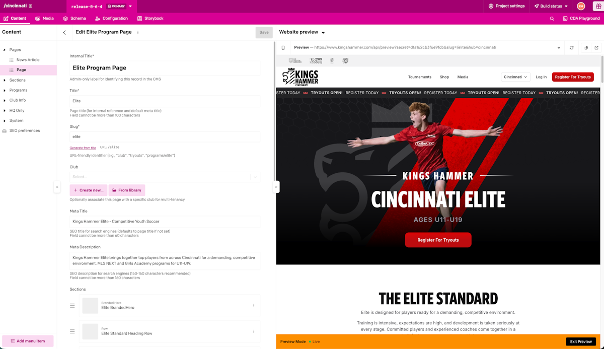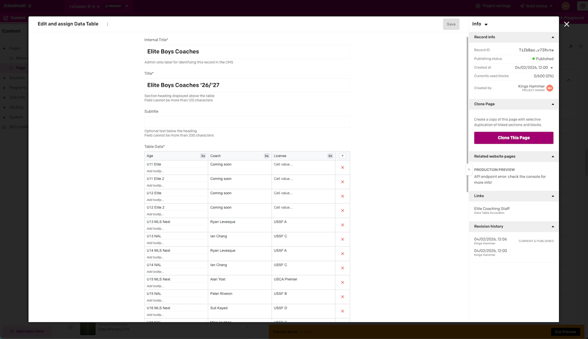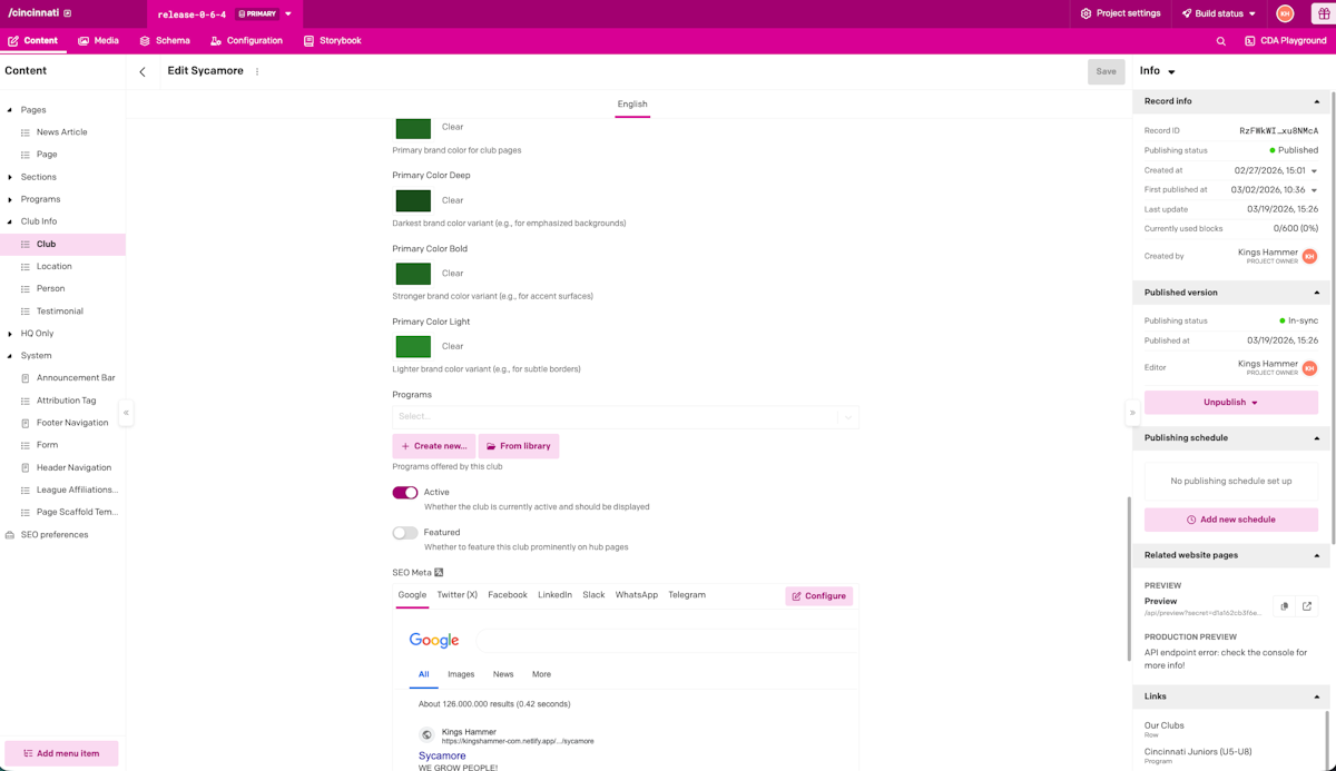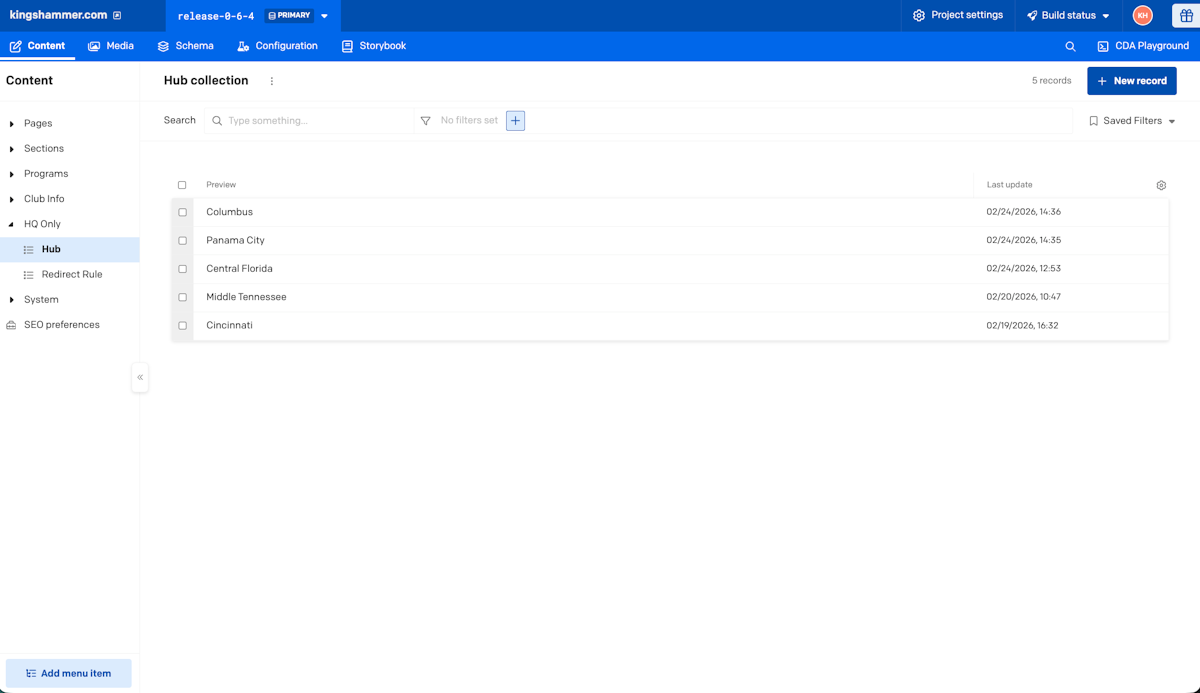 When it came to choosing the right solution, DatoCMS offered the right features for the client’s multi-project site – and a highly competitive price. Ample set up a different project for each hub, allowing staff at HQ to oversee the entire site and regional staff to make changes and update content on their respective sites. The project scales nicely, allowing Kings Hammer to easily create new sites and pages when they acquire additional clubs or add programs.