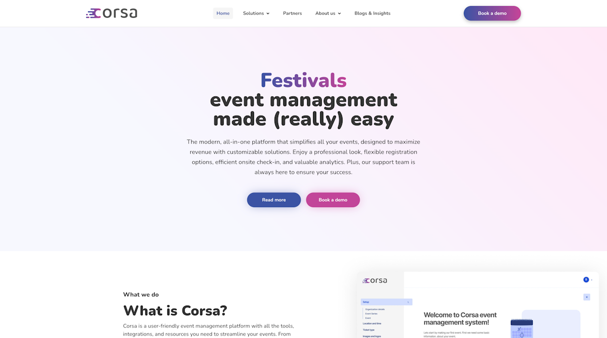 corsa.events is the marketing site for the Corsa event management system, built to clearly show what the platform can do and why it matters. It gives potential customers a simple way in, highlights key features, and reflects the professional identity we want to project. The site isn’t just about information, it’s about building trust in the technology behind Corsa.