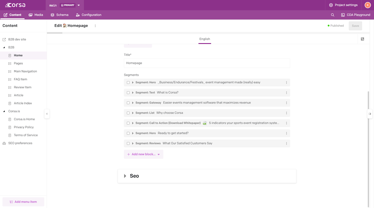 One of the biggest advantages has been Dato’s blocks system. By creating reusable modules such as event highlights, testimonials, or feature callouts, editors can quickly build new layouts without touching code. It keeps the site consistent while giving the marketing team plenty of creative freedom to adapt messaging and design as needed. The result is a site that feels polished but never rigid, able to grow alongside the Corsa event management system.