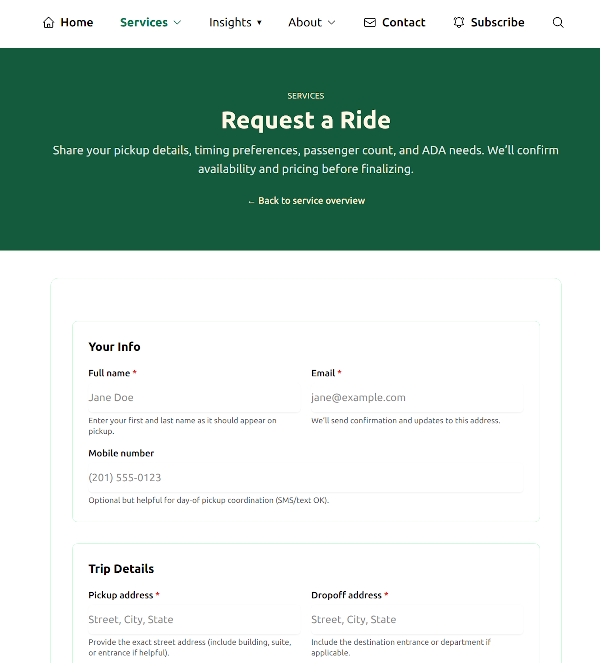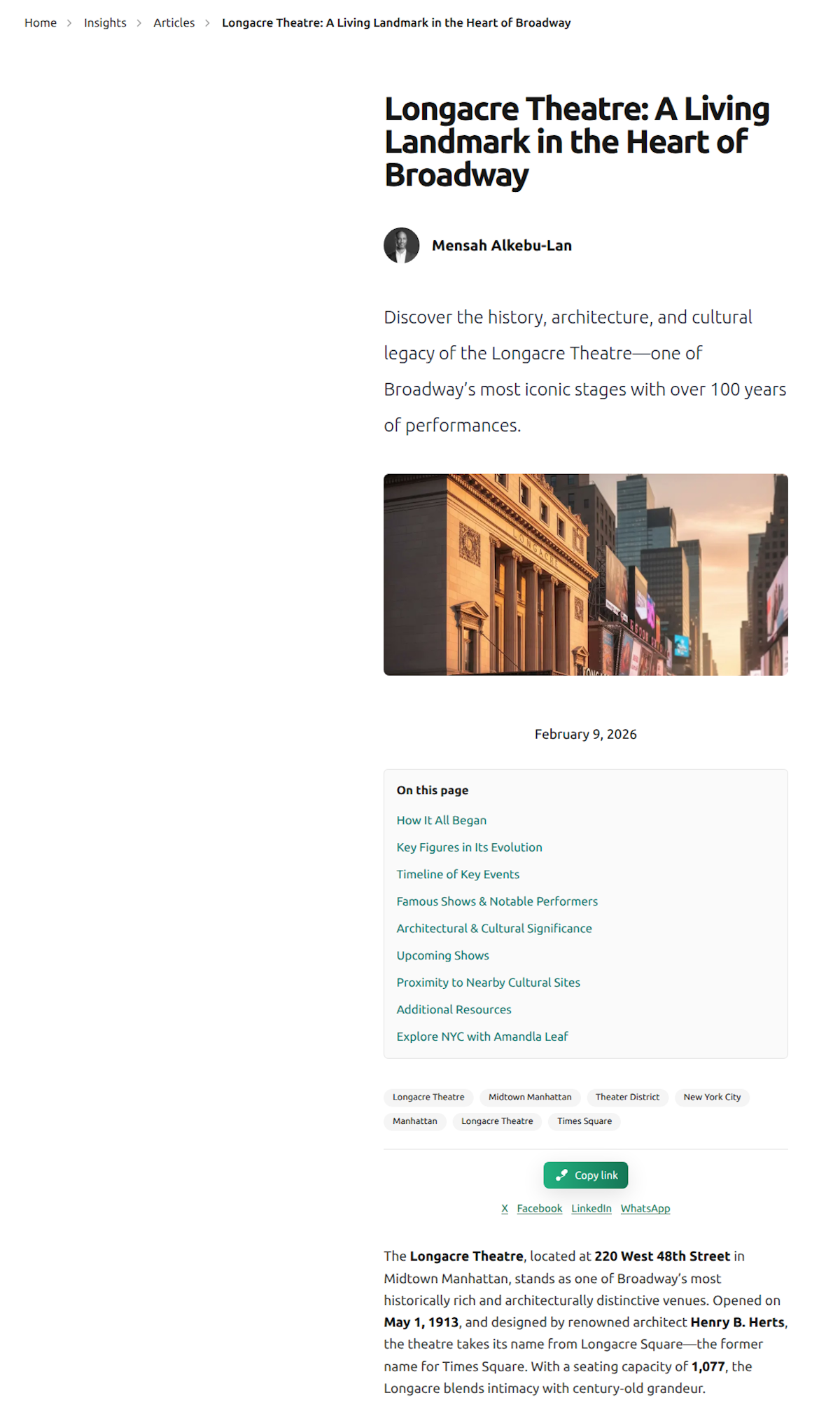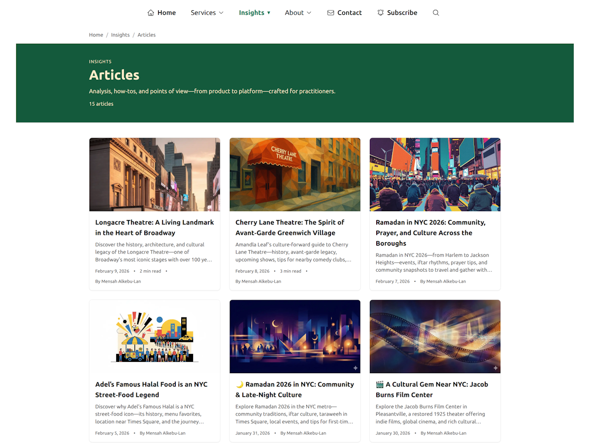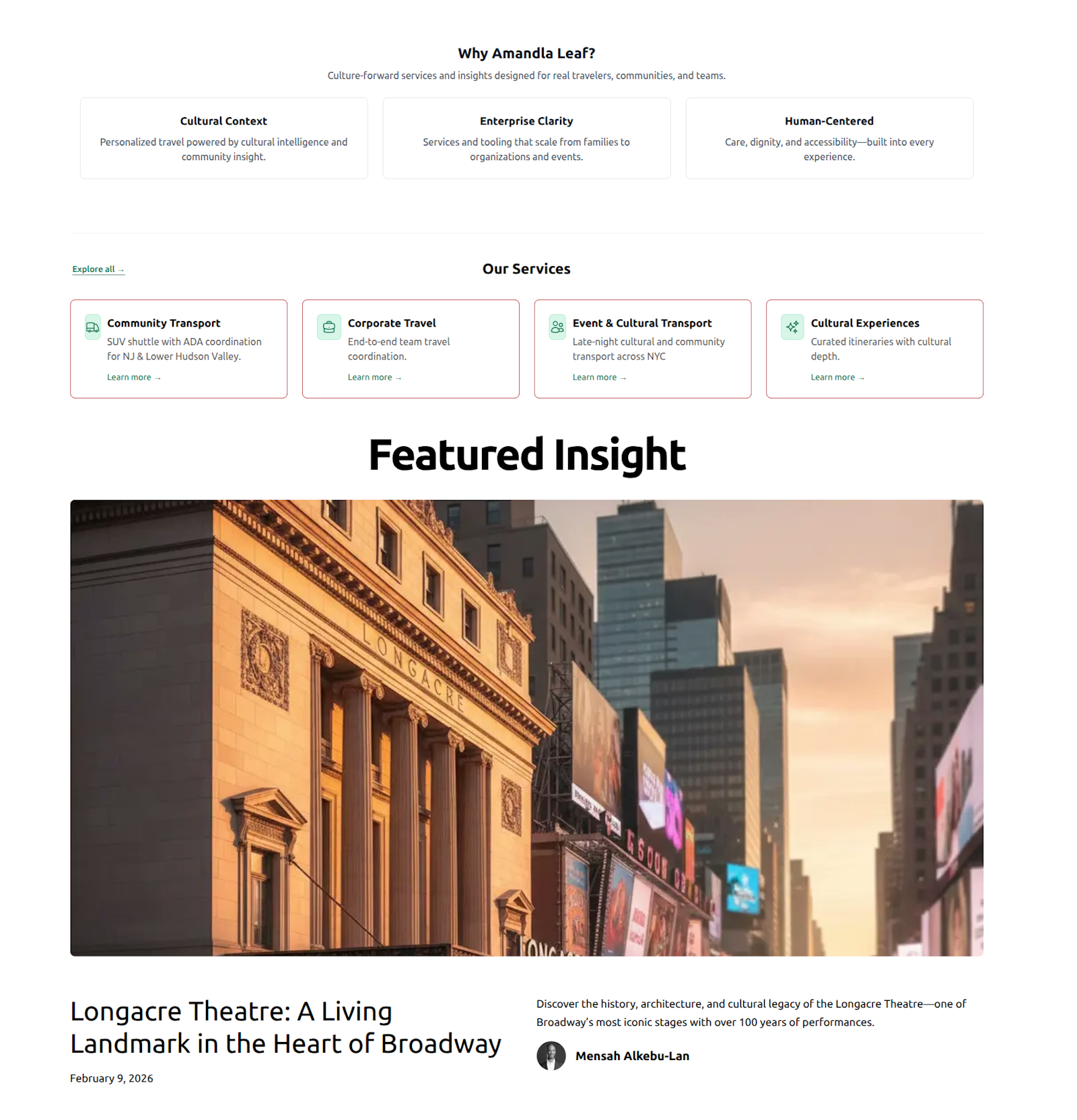 Amandla Leaf is a modern, content‑driven web application built on the Next.js App Router. The app/ structure organizes route groups for content and features—e.g., insights/ (articles, guides, advisories), services/ (including a community transport booking area), things/prayer-time/ (a calculator), and API endpoints for contact, subscribe, site-search, events, and on‑demand revalidation. Shared UI and SEO primitives live under components/, while lib/ centralizes integrations (DatoCMS client/queries, Google/Meta analytics helpers, and db.ts).