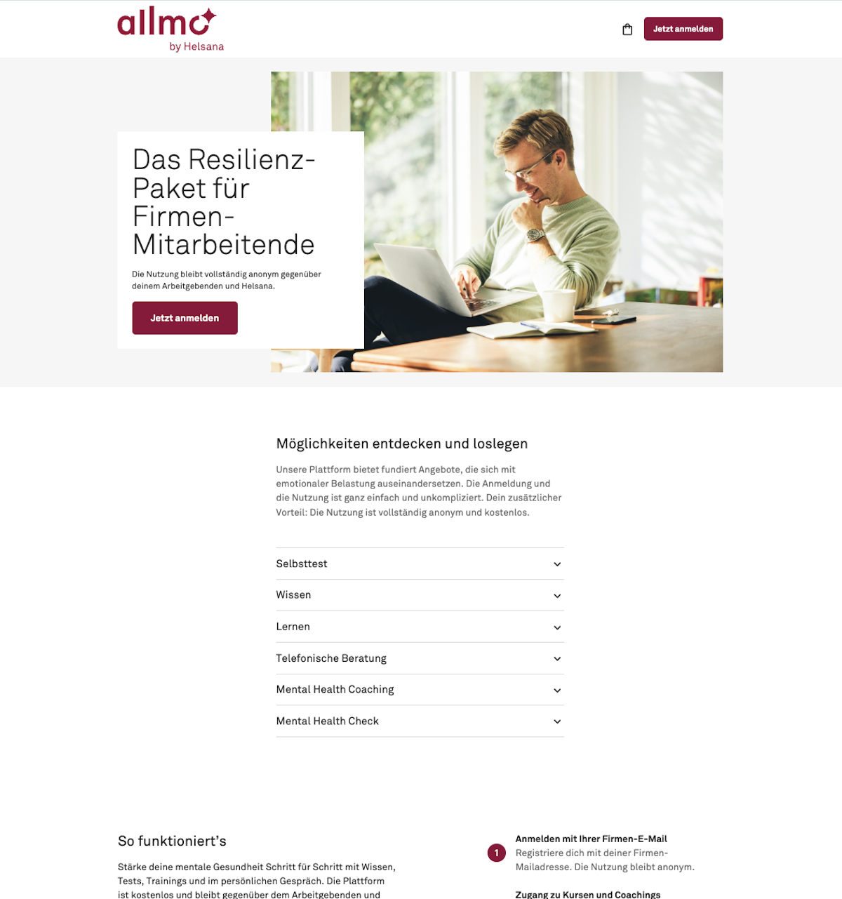 Designed for seamless user experience, allmo emphasizes simplicity: quick registration, no-cost access, and strict data privacy (no data sharing). For businesses (mid-sized firms, 150+ employees in Zurich, Eastern, and Central Switzerland), the Resilience Package promotes mental health prevention, reducing absenteeism via evidence-based content from partners like Privatklinik Hohenegg. Features encompass knowledge bases, mental health checks, and scalable services to foster self-determined health management.